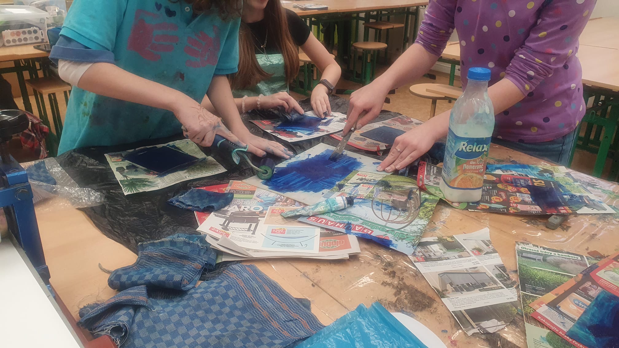 V rámci výtvarných praktik si dívky z 8. ročníků vyzkoušely jednu z nejstarších grafických technik tzv. „falešnou“ mezzotintu, která vznikla už v 17. století. Výsledné vánoční grafiky rozehrávají celou škálu