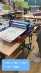 V rámci výtvarných praktik si dívky z 8. ročníků vyzkoušely jednu z nejstarších grafických technik tzv. „falešnou“ mezzotintu, která vznikla už v 17. století. Výsledné vánoční grafiky rozehrávají celou škálu bohatých tónů a sametové přechody mezi světlem a tmou.