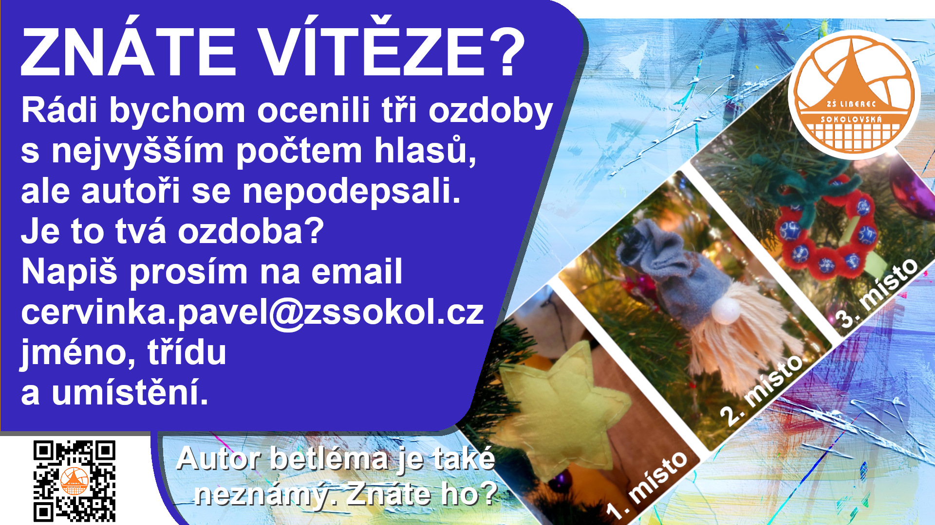 Je to tvá ozdoba? Napiš prosím na email cervinka.pavel@zssokol.cz jméno a třídu a umístění.